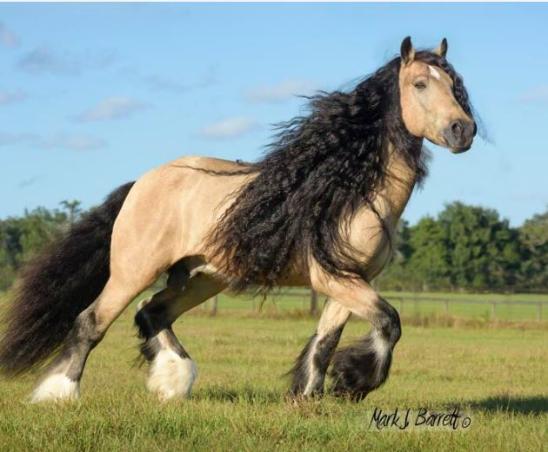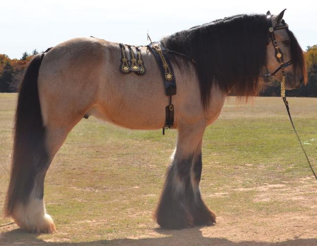 Date of Birth: 05-18-09 Sex: Stallion Color: Buckskin Height: 15h Sire: Falcon (Buckskin) Dam: Bandera Dexy's Midnight Runner Tiger Moth was the result of a very long and somewhat risky gamble. There are many gypsy breeders out there with unlimited funds at their disposal, but (alas!) I am not one of them! I put a lot on the line for this boy, and I know I am very fortunate it all worked out as it did. I fell in love with Falcon, Tiger Moth's sire, after receiving a picture of him in an email. Falcon is a breathtakingly beautiful solid buckskin stallion with profuse black feathering. At the time, Falcon was owned by Irish Tinker Stables in the Netherlands. His frozen semen was only available to one farm in the U.S. and they weren't sharing. Thus it seemed the only way for me to get a foal by Falcon was to buy a mare in Europe and have her sent to Falcon's stable. So that is exactly what I did. I purchased Dexy, Tiger Moth's dam, from Sherry Evertson of Lazy River Gypsy Horses in Oregon. As I wanted a solid (vice tobiano) foal, Dexy fit the bill perfectly. At the time, Dexy was still in England. I had Dexy transported to the Netherlands for a romantic encounter with Falcon, and 11 months later, Tiger Moth was the result. I could not be more pleased with this boy. Tiger Moth pretty much has it all - outstanding conformation, beauty, and temperament. He has a stout build, deep body, great bone, and hair to spare. He is gentle, friendly and sweet. Tiger Moth is a beautiful golden color and may have inherited his dad's 'sooty' gene. He has smudging around his eyes and several dark patches on his body. His 2 front legs will have black feather and his 2 hinds will have white feather. Tiger Moth is literally a dream come true, and I thank Sherry Evertson of Lazy River Gypsies, Ellen of Irish Tinker Stables, and all the well-wishers that helped make this happen. DNA Tested: Red Factor: Ee Agouti: Aa Tobiano: nn Cream: nCr |